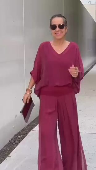 A blusa de caimento solto e decote em “V” traz um ar moderno e feminino, enquanto a calça ampla garante liberdade e movimento com muito charme.