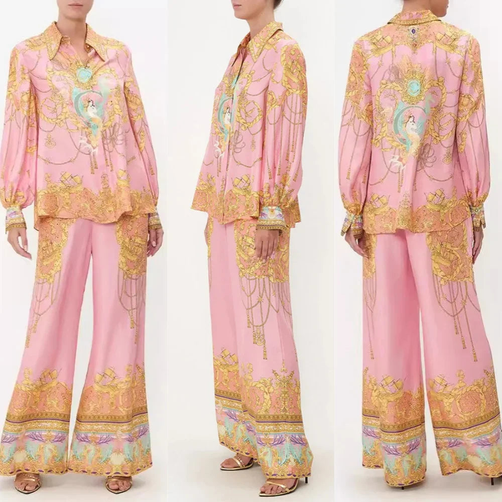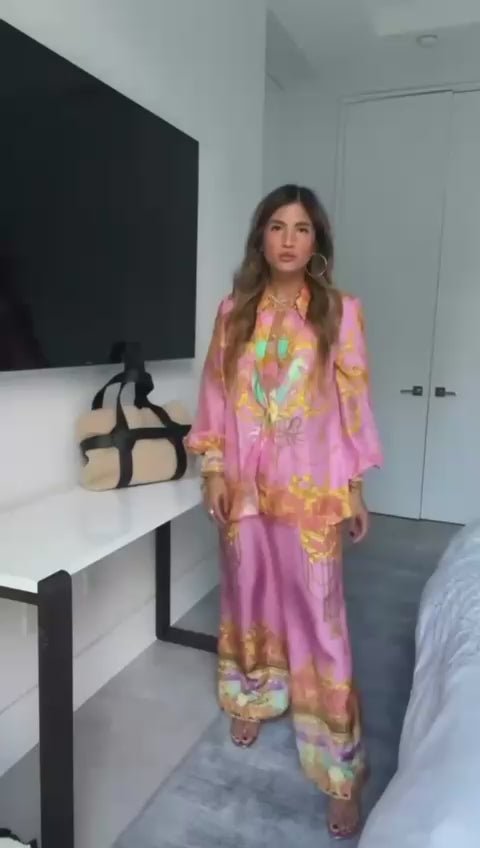 A calça ampla confere movimento e sofisticação, enquanto a camisa com corte moderno permite composições que vão do casual chic ao sofisticado.