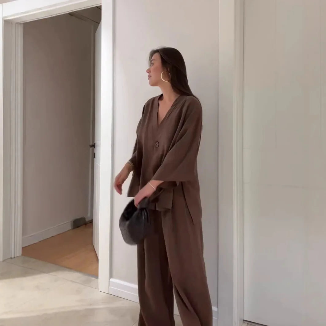 A camisa de corte reto e mangas amplas transmite leveza e elegância, enquanto a calça pantalona de cintura alta garante caimento impecável e conforto absoluto. Um conjunto que valoriza a silhueta de forma natural e estilosa.