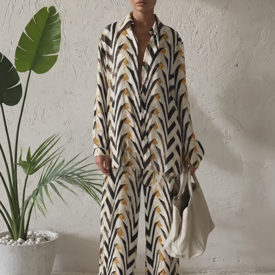 Composto por uma camisa de caimento fluido e calça de modelagem reta, este conjunto é a solução definitiva para quem busca estar impecável sem esforço (o famoso effortless chic).