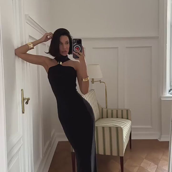 O Vestido Mêlania é sinônimo de sofisticação atemporal. Seu design com gola alta e detalhe frontal torcido com argola dourada cria um visual impactante e ultrafeminino. A modelagem ajustada valoriza as curvas na medida certa, enquanto o comprimento longo alonga a silhueta e transmite imponência.
