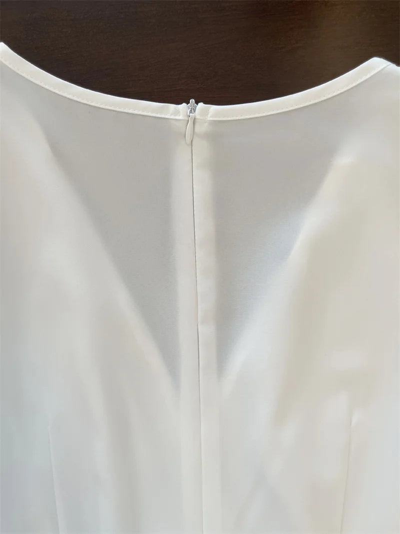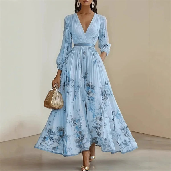 Seu decote em V e cintura marcada valorizam o corpo, enquanto o movimento da saia cria um efeito sofisticado a cada passo.