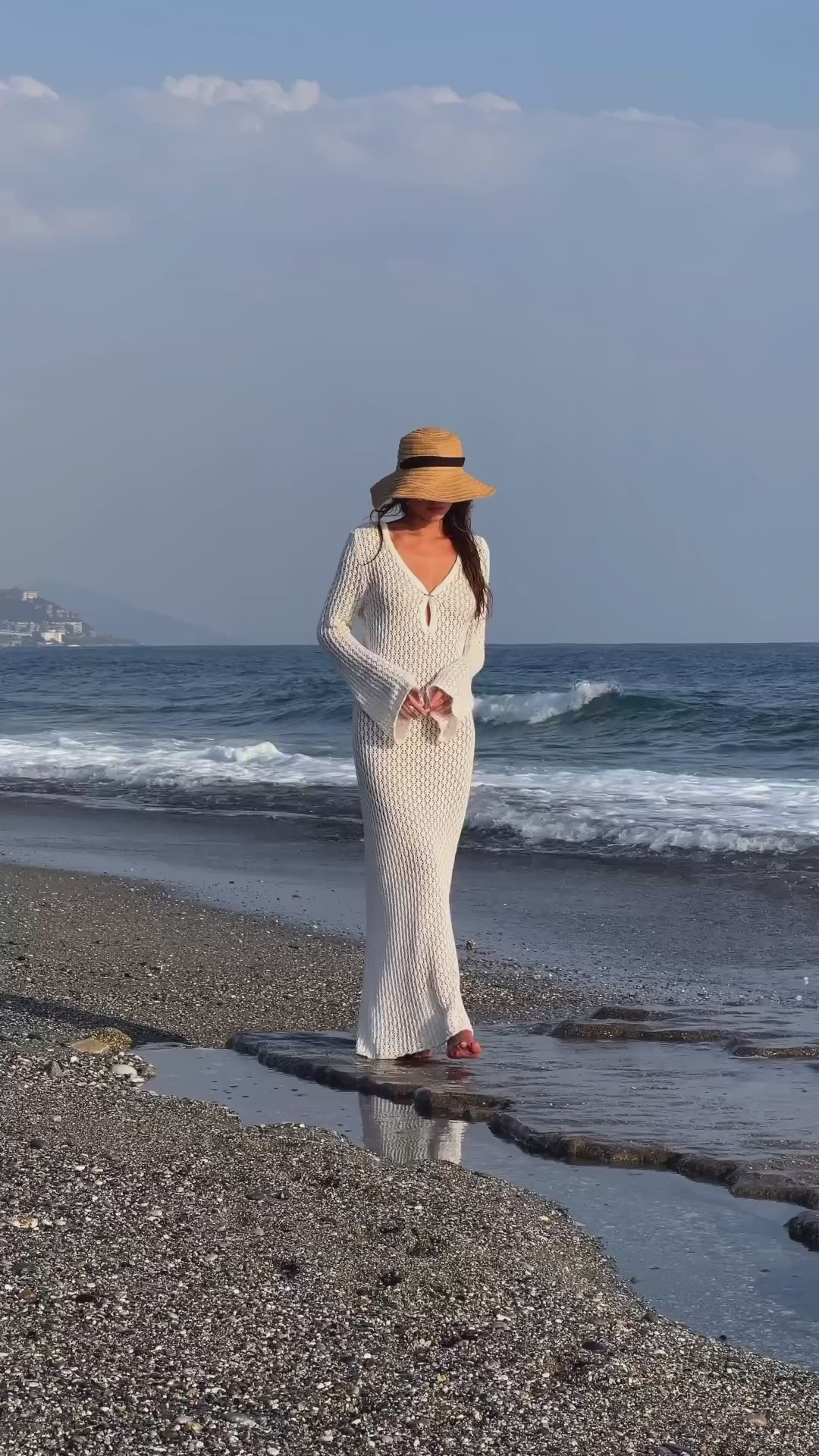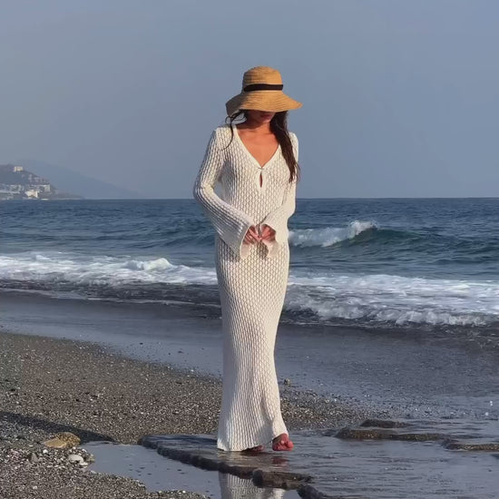 Feito em tricô leve, este vestido longo é ideal para passeios na praia, cruzeiros ou festas à beira-mar.